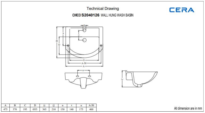 Wall Hung Wash Basin | S2040126 | Size: 475 x 370 x 195 mm