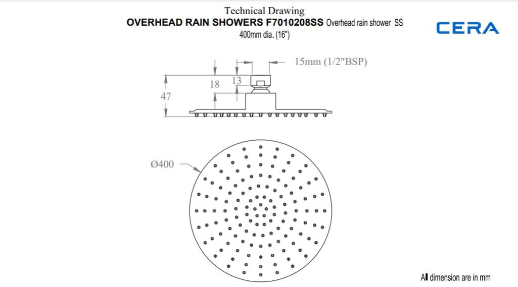 Faucet Type: Cera Overhead Rain shower SS 400 mm dia (16")