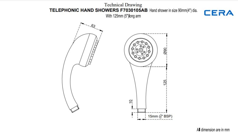 Telephonic Hand shower 90 mm (4”) dia with 125 mm (5”) long arm without wall hook & hose | F7030105AB