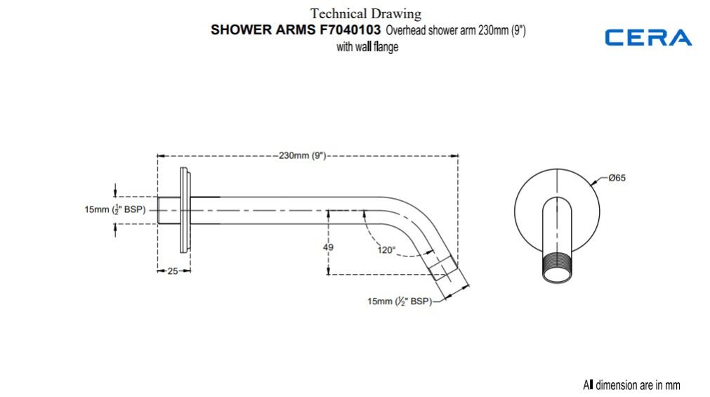 Faucet Type: Brass Round Overhead shower arm 230 mm (9”) with wall flange