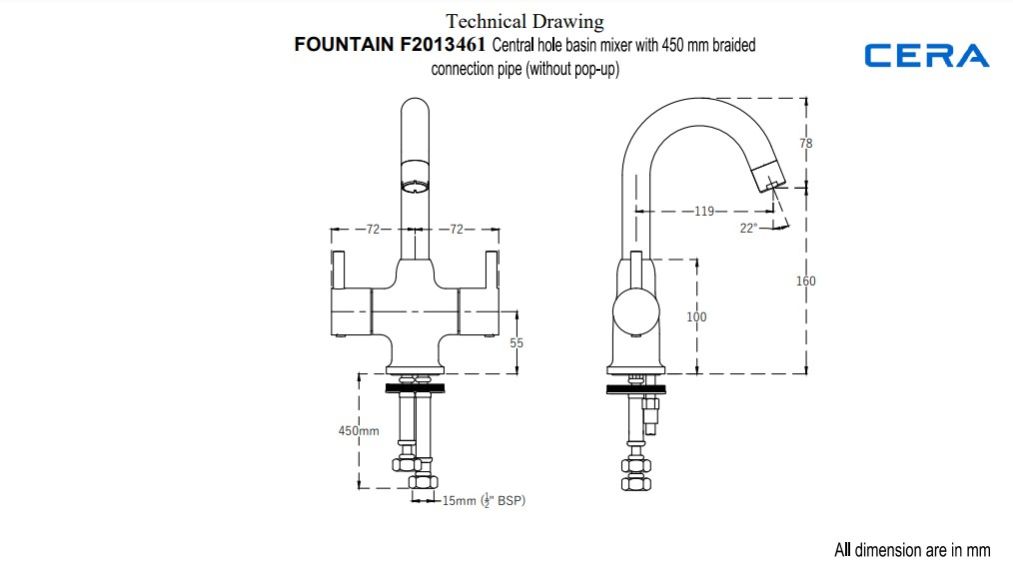 Faucet Type: Fountain Quarter Turn Central hole basin mixer Hot & Cold with 450 mm braided connection pipe without pop-up