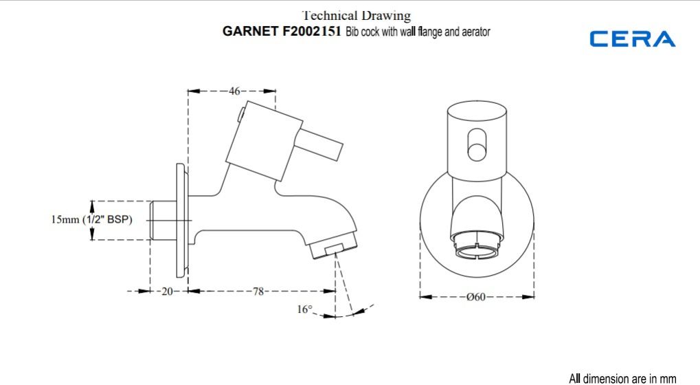 Faucet Type: Garnet Quarter Turn Short Body Bib cock with wall flange and aerator