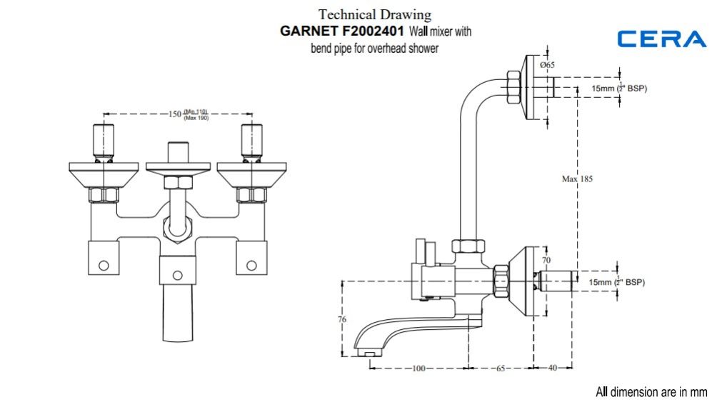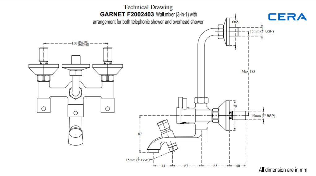 Garnet | Quarter Turn with bend pipe for overhead shower | 3 in 1 F2002403 : Wall mixer (3-in-1) with arrangement for both telephonic hand shower and overhead shower with bend pipe | 2 in 1 F2002401
