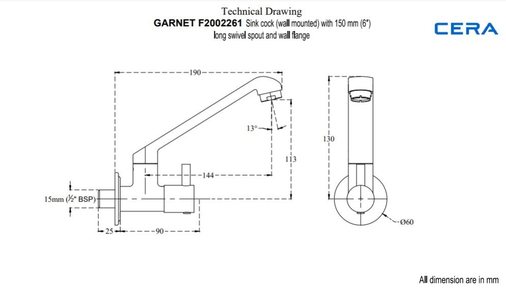 Faucet Type: Garnet Quarter Turn Wall mounted Sink cock with 150 mm (6") long swivel spout and wall flange