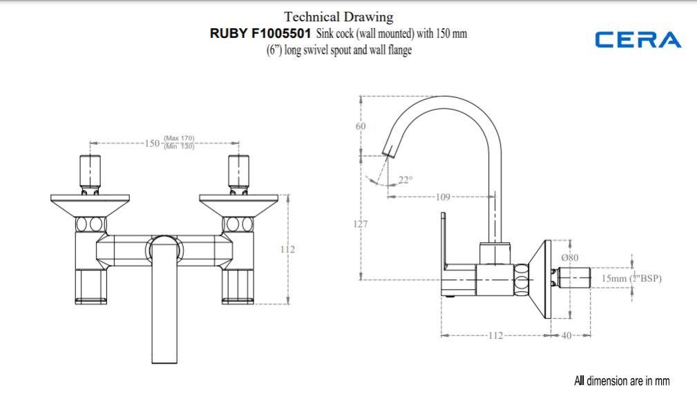Faucet Type: Ruby Quarter Turn Wall mounted Sink mixer Hot & Cold with 150 mm (6”) long swivel spout and wall flange