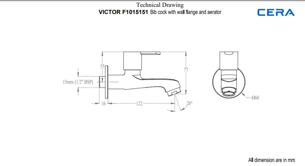 Faucet Type: Victor Quarter Turn Long body Bib cock with wall flange and aerator