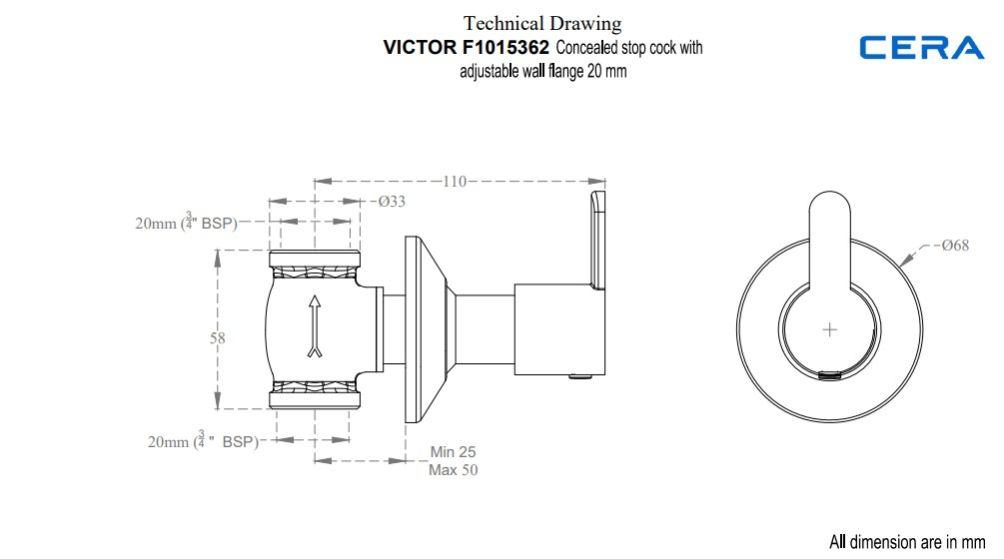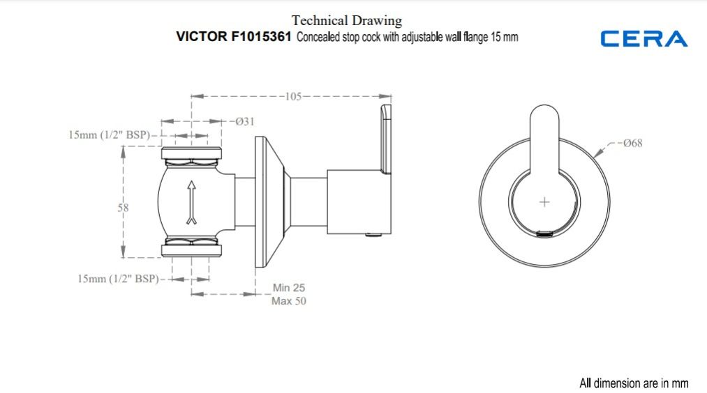 Stop Cock Concealed stop cock with adjustable wall flange | F1015361 - 15 mm | F1015362 - 20 mm