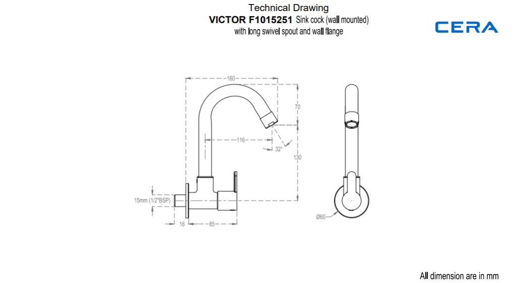 Faucet Type: Victor Quarter Turn Wall mounted Sink cock with long swivel spout and wall flange