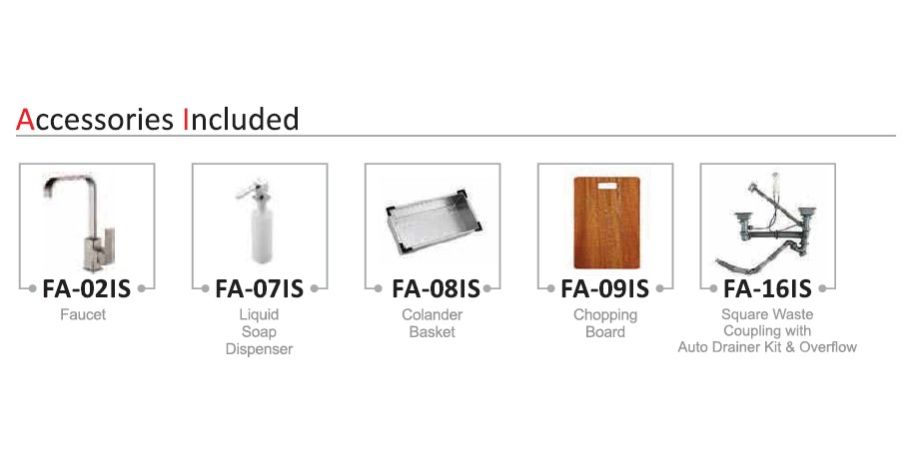Included Accessories : Faucet , Liquid Soap Dispenser , Colander Basket , Chopping Board , Square Waste Coupling with Auto Drainer Kit & Overflow