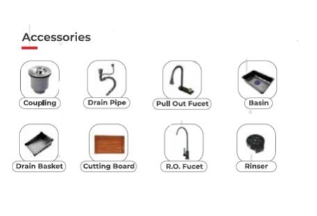 Included Accessories : Coupling , Drain Pipe , Pull Out Faucet , Basin , Drain Basket , Cutting Board , R.O. Faucet , Rinser
