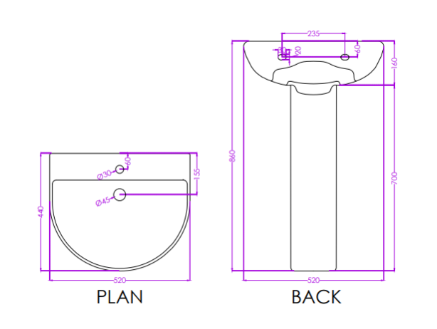 Full Pedestal Basin | P5415PW0203 (Basin), P5418PW0003(Pedestal) | Dimensions : 565x450x825mm
