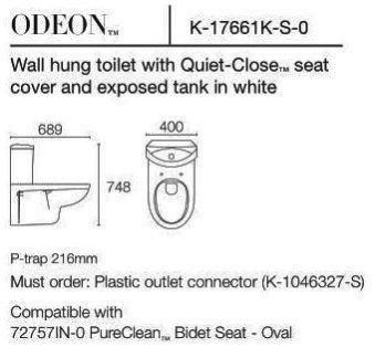 Wall Hung Exposed Tank Toilet | P-Trap : 216mm | K-17661K-S-0 | P-Trap : 216mm / 22cm / 9" inches