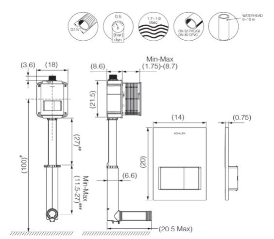 • Dual flushrn• Pneumatic Actuation, fewer partsrn• Adjustable flushing volume with no effect on flow ratern• Adjustable Flow ratern• Water supply shut-off provisionrn• Pneumatic time delay delivers superior flush accuracy & repeatabilityrn• Replaceable dual stage In-Line filter made of Stainless Steelrn• Actuation force less than 22 Nrn• Remote installation possiblern• Brass Inlet connectionrn• Removable valve body for easy maintenancern• Back pressure vacuum breakerrn• Chlorine-Chloramine resistant rubber sealsrn• Made of high grade molded plastic & brassrn• WC connection set includes Height adjustable trap, Bowl Inlet pipe, &rnconstruction Plugrn• 4 inch wall installationrn• Easy to install