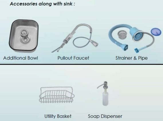 Included Accessories : Additional Bowl, Pullout Faucet, Strainer & Pipe, Utility Basket, Soap Dispenser